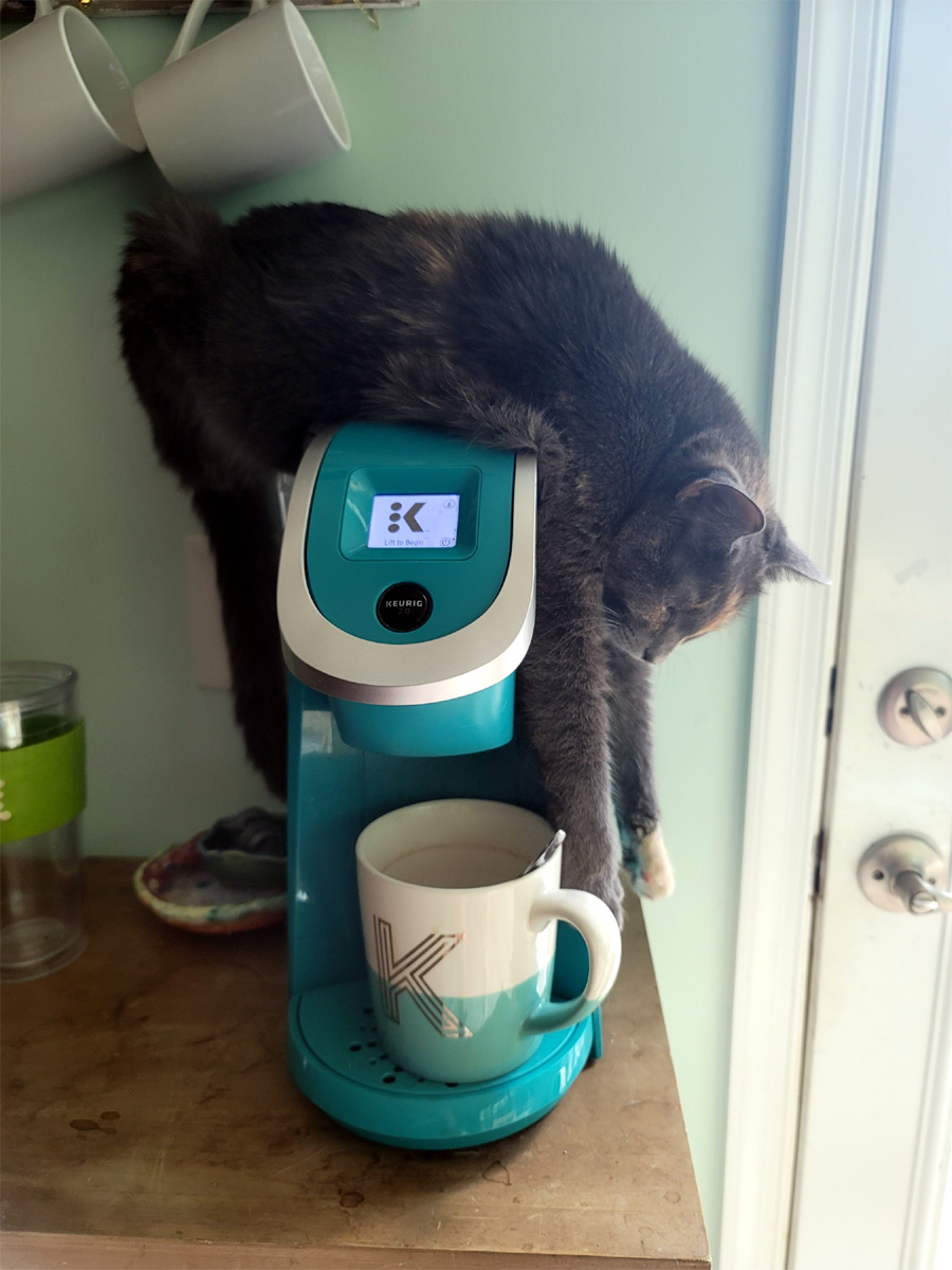 Camie loves to help me keep my coffee nice an warm in the morning.
