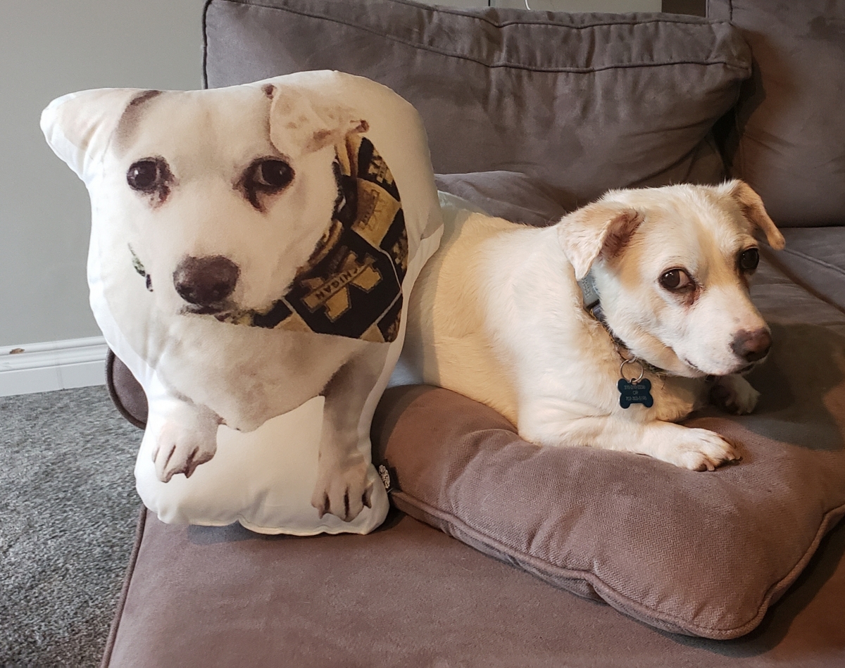 Rocky the corgi mutt does not approve of his pillow doppleganger